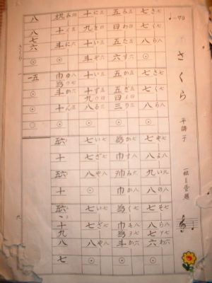 実は、昔は、箏っていうのは目の見えない方の為の楽器でした。だから楽譜っていうものは、ずっと存在しなかったのです。 だけど、昭和になってから『筑紫歌都子』が、『宮城道雄』の作品を採譜して箏の譜面というものを作りました。 箏の楽譜は、すべて漢数字です。「一二三四五六七八九十斗為巾」 生田流は縦書きの楽譜、山田流は横書きの楽譜。 読み方はとってもカンタン!『一』って書いてあったら、一番下の「一」の絃を弾けばいい!『二』だったら「二」の絃。 だから、小学1年生でも弾けちゃいます。 数字の横に何の番号もふっていなければ、基本的に使う親指で弾きます。もし、2とか3とかの算用数字が絃の番号『一』とかの横にふってあったら、それぞれ「人さし指」「中指」で弾くということ。たったそれだけ! お休みは◯(四分休符)や、△(八分休符)で表しています。これで、もう箏、弾けちゃいそうでしょ? 最近ではこの「箏譜」だけではなく、他の音楽のジャンルとの共通言語である「五線譜」で弾くのはあたりまえのことになってきています。私は「コード譜」も使います。 みなさん御存知の「さくら」の楽譜 カンタンだからなんとな〜く分かりそうでしょ? 年期の入った楽譜、ボロボロでごめんなさ〜い! 私が3歳の頃から使っている譜面です (6)KOTOをANAの飛行機で運ぶに続く |