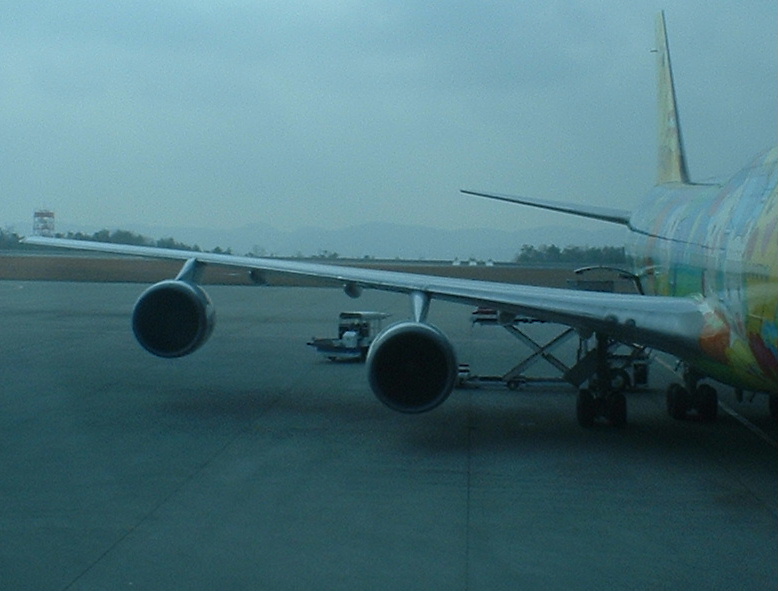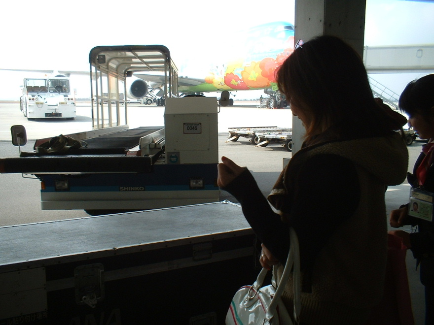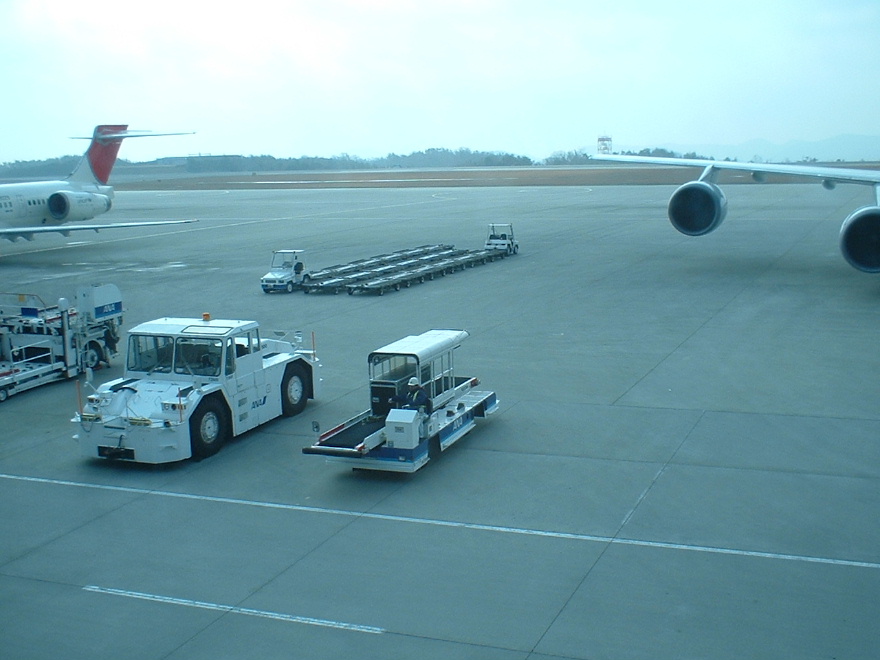 ポケモン飛行機から降りてくる私の箏! 翼の向こう側に見える、白いベルトコンベアの上を降りてくるところ。 黒いハードケースの中に入っています。 |