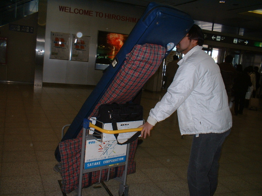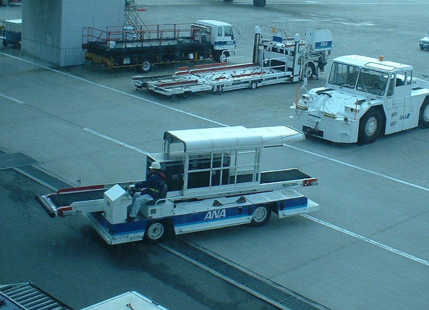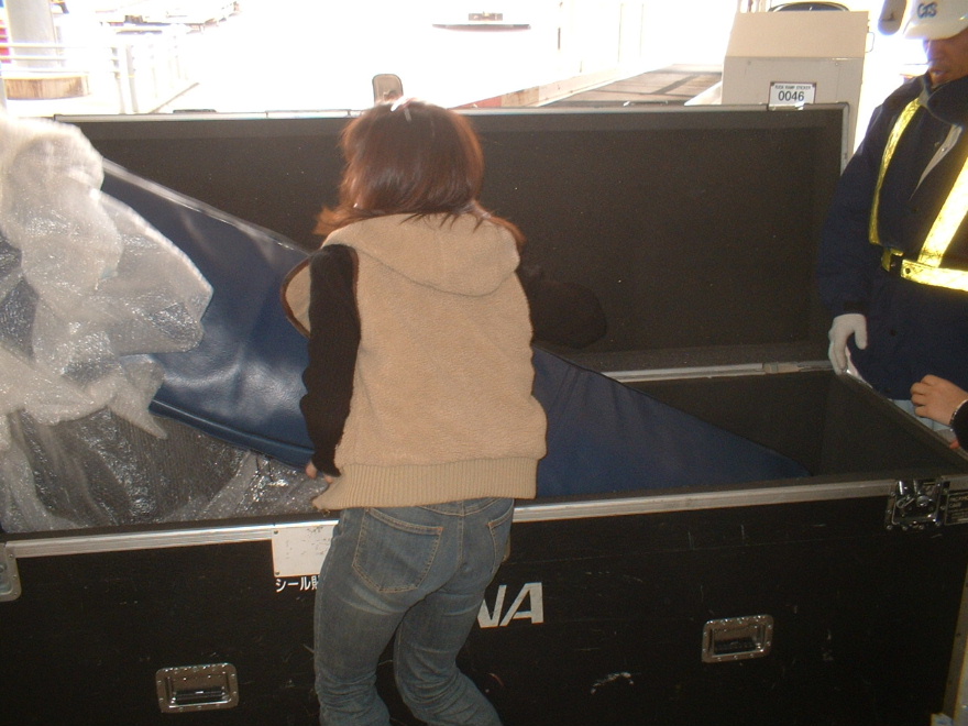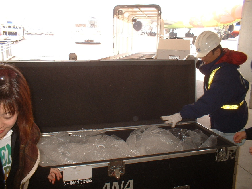 ハードケースが降ろされたところ。 私はハードケースが到着するところまで迎えにいきます。 楽器には持ち方や方向などがあるため、ANAさんではケースへの出し入れには本人が立ち会うことを許可して下さっています。 |
